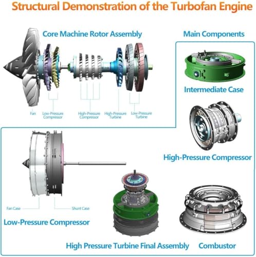 El modelo realista visualmente impresionante proporciona una representación realista de los componentes principales del motor de un avión con que incluyen un ventilador de primera etapa, un compresor de baja presión de dos etapas, un compresor de alta presión de cuatro etapas, una turbina de alta presión de primera etapa y una turbina de baja presión de dos etapas
