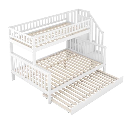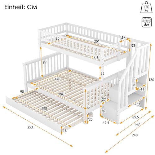 Lo mejor de las literas es que crean una solución de ahorro de espacio en su dormitorio mientras proporcionan un almacenamiento práctico. Tome por ejemplo este juego: este juego de madera de pino macizo con diseño de listones en la barandilla, cabecero y pie es una gran opción para el estilo tradicional de la habitación. Y con la escalera incluida con compartimentos de almacenamiento, es perfecta para guardar objetos pequeños. La cama plegable incluida hace de esta pieza una gran opción para fiestas de pijamas. Y con los juegos de somier incluidos, no se requiere somier. Descripción: Material de la cama: madera de pino+tablero Tamaño: 90 x 200/140 x 200. gemelo:blanco Número de paquetes:3 Requiere montaje: sí. Tamaño: Dimensiones del producto: 242 x 148 x 160 cm. Dimensiones del paquete: tenga en cuenta la especificación. Tamaño de la litera superior: 201 x 91 cm. Dimensiones de las literas inferiores: 201 x 140 cm. Dimensiones: 198 x 90 cm. Altura total: 160 cm. Capacidad de carga de la cama superior/inferior: 150 kg/200 kg. Recomendar el grosor del colchón para la litera superior: 10-15 cm. Recomendar el grosor del colchón de plumón litera: 15 – 20 cm. Recomendar el grosor del colchón extraíble: 15-20 cm.