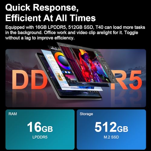 Memoria y almacenamiento de gran capacidad al alcance de la mano: con 16 GB de RAM LPDDR5 y 512 GB de almacenamiento SSD M.2, con el T40 ya no tendrás que preocuparte por agotar la memoria o tener poco espacio de almacenamiento. Ya sea para almacenar archivos grandes, descargar videos HD o ejecutar software profesional, es fácil de administrar, para que pueda disfrutar de su vida digital como mejor cree