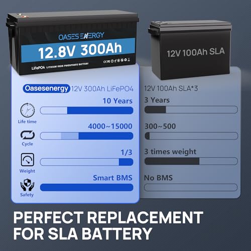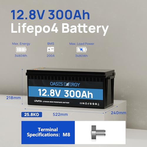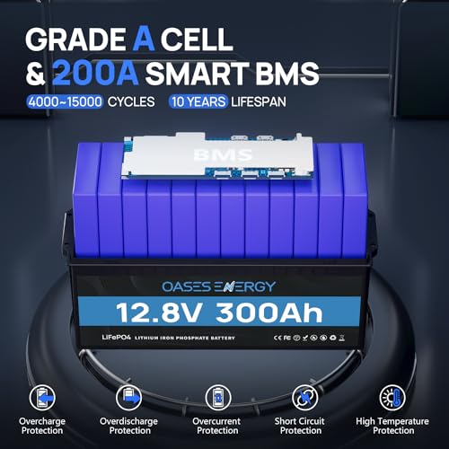 Especificaciones: Oasesenergy LiFePO4 12 V 300 Ah batería de litio mit 200 A BMS und 4000 ~ 15000 Zyklen, 10 Jahre Lebensdauer, 3840 Wh 12 V LiFePO4 Akku für Wohnmobil, Solarpanel Kit, Backup-Strom, Camping, Boote
