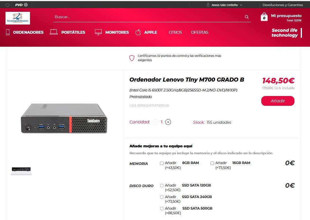 Ordenador Lenovo Tiny M700 GRADO B