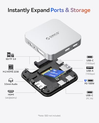 Innovadora estación de oficio magnética M.2: la estación de oficio magnética ORICO combina un gabinete NVME m.2 2230 + hub USB C con 8 puertos (4K @60Hz HDMI, 10Gbps USB-C/A, SD/TF 3.0, 0.138 in AUX, 100W PD). Amplía tanto el acumulación como los puertos, admitiendo la conmutación perfecta entre teléfonos, tabletas y computadoras portátiles, sin actuación de acumulación de acción