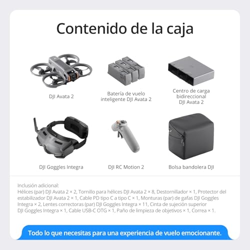 Incluye el dron, 3 baterías inteligentes, DJI RC Motion 2, DJI Goggles Integra, etc. Ofrece una experiencia de vuelo inmersiva para todas tus aventuras. Perfecto para pilotos aspirantes.
