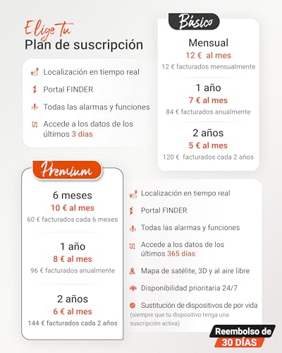 🏷️ SUSCRIPCIÓN Y GARANTÍA: Incluye una tarjeta SIM y ofrece 2 años de garantía, junto con soporte al cliente 24/7 en múltiples idiomas. Controla tus localizadores con nuestra app gratuita compatible con Android e iOS y compártela con toda la familia. Elige entre los planes Premium o Básico, con opciones desde mensual hasta cada 2 años, desde 5€ al mes, con frecuencia de pago según la duración de la suscripción. Consulta los detalles de precios en las imágenes.
