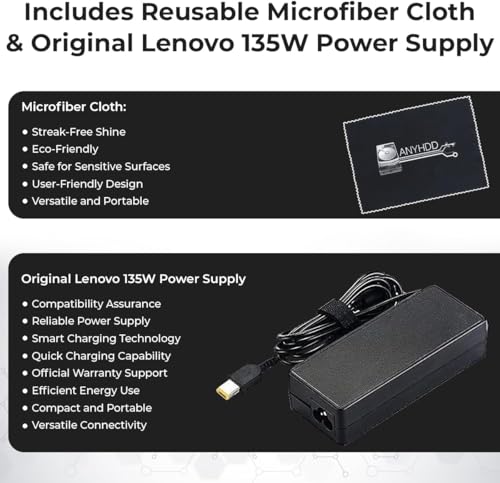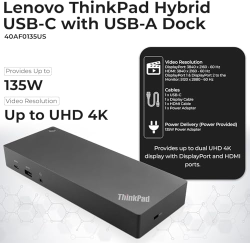 El paquete incluye: 40AF0135US ThinkPad Hybrid USB-C con base USB-A, adaptador de corriente CA de 135 W, cable USB-C, cable HDMI, cable de puerto de pantalla, paño de microfibra