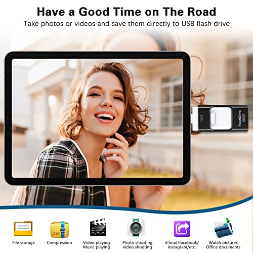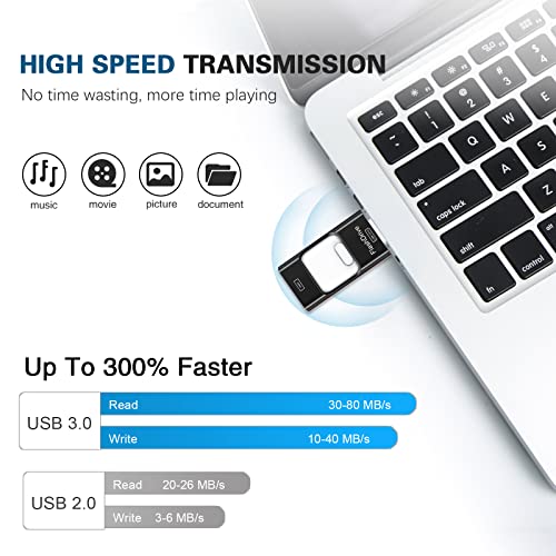 Copia de seguridad de alta velocidad y un clic — Las barras USB 3.0 experimentan hasta 80 MB/s de lectura y 40 MB/s de escritura, y las fotos, los vídeos y los documentos se pueden hacer copias de seguridad con un clic en la memoria USB. Libere rápidamente espacio de almacenamiento en su dispositivo, ahorre su tiempo. USB Stick lightning, por lo que es fácil crear más espacio de almacenamiento.