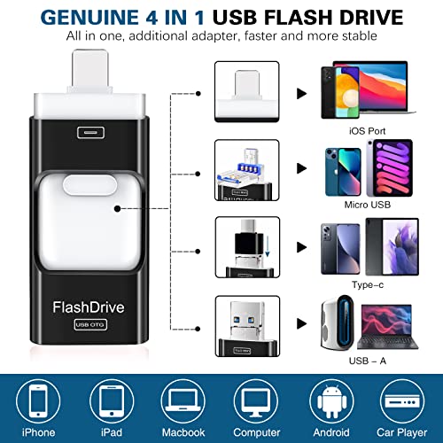 Memoria USB 4 en 1: facilita la transferencia de archivos — conector iOS + conector Android + tipo C / USB C + USB 3.0 y se puede utilizar para teléfono/dispositivos iOS, Android / PC. USB Memory Stick soporta importantes formatos de vídeo y música, permite reproducir películas y escuchar música directamente desde la unidad flash USB de 256 GB. También es compatible con el intercambio de datos entre el PC y el teléfono móvil para la memoria del teléfono.