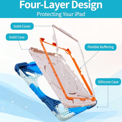 Protección única de triple filtración de golpes: en comparación con diseños anticuados, la exclusiva funda triple absorbente de golpes está diseñada con un parachoques adicional acción de material de impacto de alto rendimiento que absorbe más entusiasmo de empalme entre la tableta y la carcasa trasera rígida.