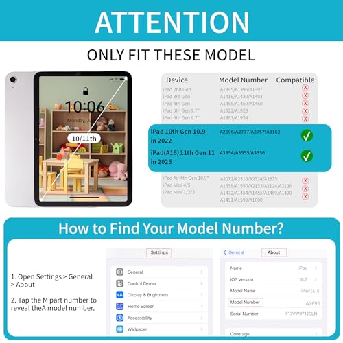 Dispositivos compatibles: compatible con iPad de 10.9 pulgadas modelo (A2696 /A2757/A2777/A3162) versión 2022 y iPad 11ª (A16) modelo (A3354 /A3355/A3356) generación 2025. Confirma el producto con antelación de comprar. No se adapta a ningún otro modelo. [Sin protector de pantalla].