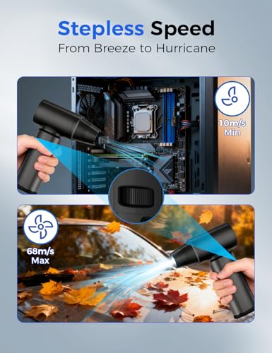 Plumero de aire eléctrico ajustable de velocidad continua: este plumero eléctrico permite un ajuste continuo de la velocidad del flujo de aire, que va desde un mínimo de 32.8 ft/s hasta un máximo de 223.1 ft/s. Se adapta a diversos escenarios, eliminando sin esfuerzo y rápidamente el polvo y las superficies de limpieza, desde un flujo de aire ultra bajo para instrumentos de precisión hasta un flujo de aire de alta velocidad para limpiar las hojas caídas. Cuenta con tres velocidades de flujo de aire ajustables: – Nivel 1: 85.3 ft/s (60,000PRM) – Nivel 2: 150.9 ft/s (120,000PRM) – Nivel 3: 223.1 ft/s (180,000PRM) para adaptarse a diversos requisitos de limpieza.