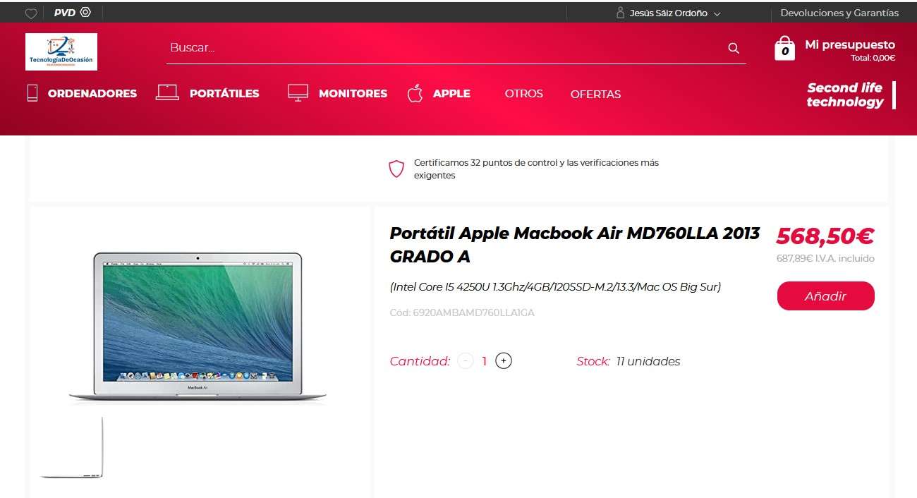 | Características Equipos comprobados y testeados completamente. Pueden tener signos de desgaste o arañazos en su carcasa, o pantalla, pero son completamente funcionales.GRADO AEstos equipos incluyen preinstalacion original de Mac OS Big Sur v.11.1Macbook AIR MD760LLA Mediados de 2013Especificaciones: · Marca APPLE – Testeados y 100% verificados |