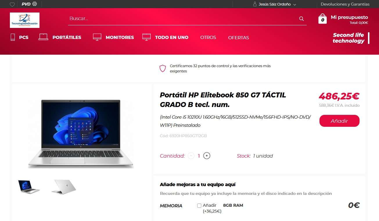 Portátil HP Elitebook 850 G7 TÁCTIL GRADO B tecl. num.
