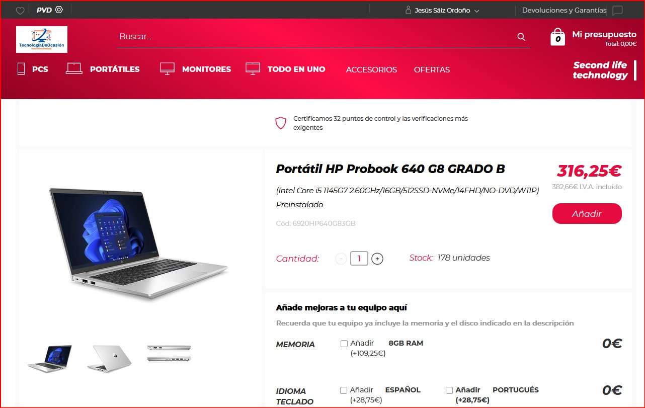 | (Intel Core i5 1145G7 2.60GHz/16GB/512SSD-NVMe/14FHD/NO-DVD/W11P) Preinstalado |