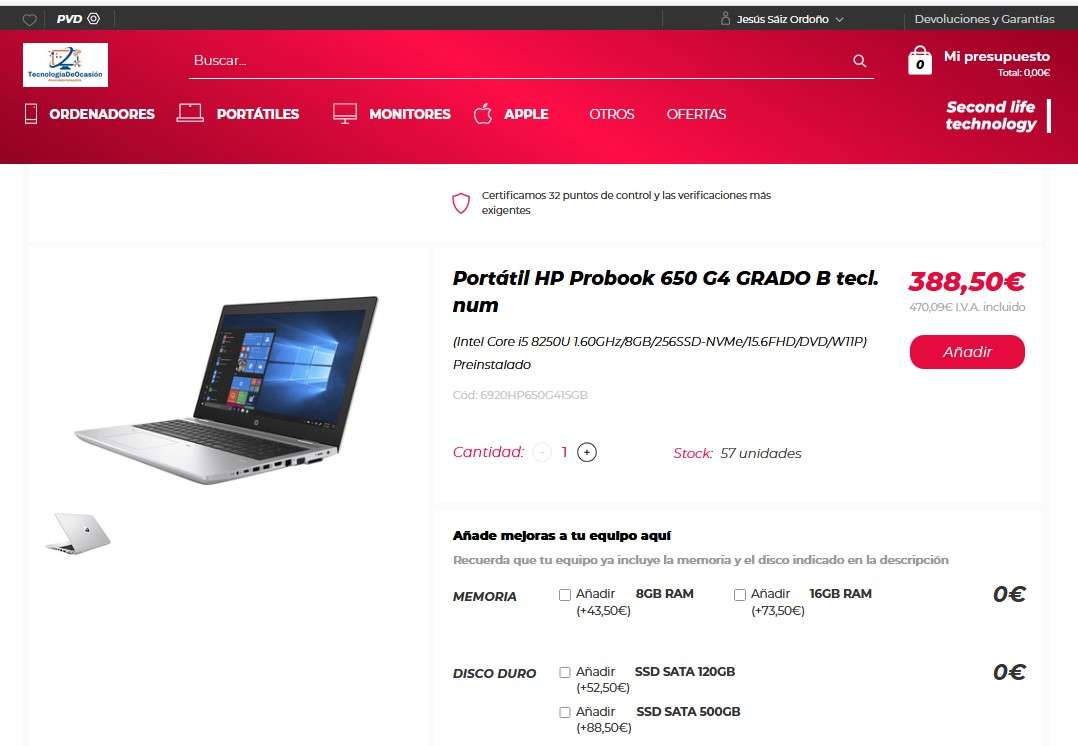 Portátil HP Probook 650 G4 GRADO B tecl. Num (Ampliable)
