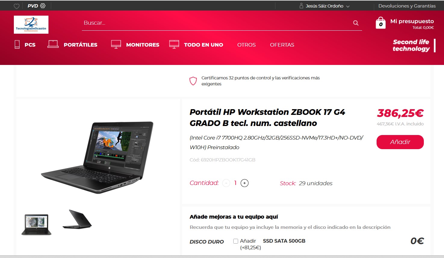 Portátil HP Workstation ZBOOK 17 G4 GRADO B tecl. num. Castellano -ampliable-