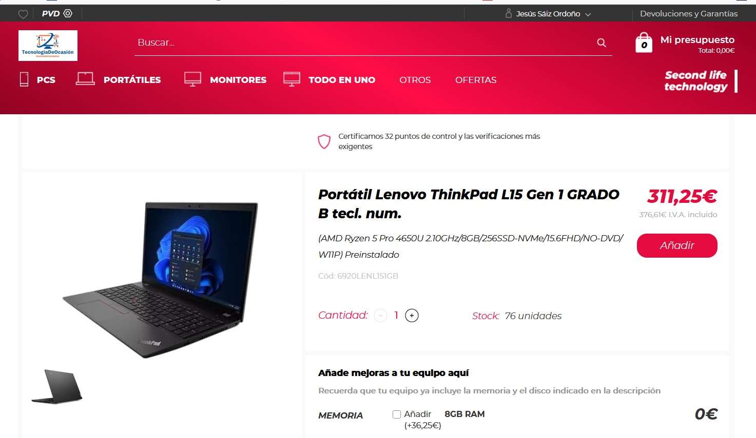 | (AMD Ryzen 5 Pro 4650U 2.10GHz/8GB/256SSD-NVMe/15.6FHD/NO-DVD/W11P) Preinstalado |