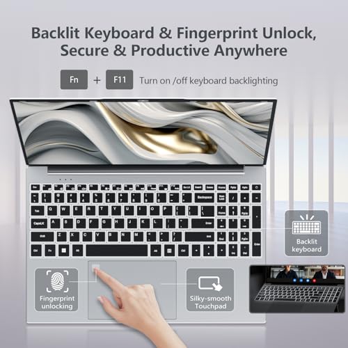 Portátil para juegos, Celeron N150 (hasta 3.6 GHz), tapa superior de 15.6 pulgadas con 16 GB DDR4 512 GB SSD, huella digital KB retroiluminada, FHD 1920 x 1080, Win 11 Pro, WiFi 5, BT 4.2, portátiles