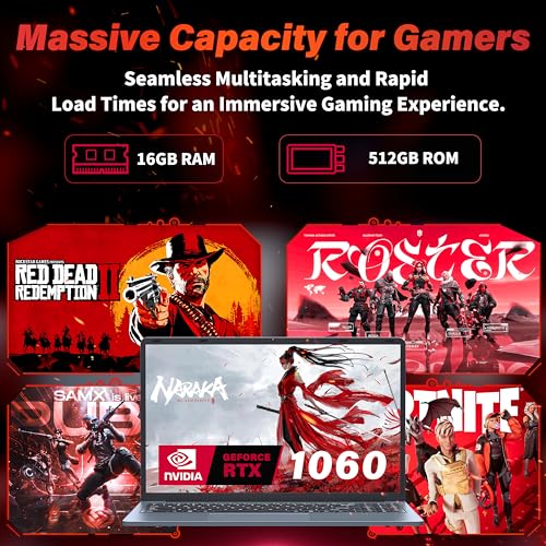 Portátil ultrafino para juegos FHD de 15.6 pulgadas, en tel N95, Nvidia GTX 1060 4GB, 16GB RAM 512GB SSD, Win 11 Pro – Cuaderno de alto rendimiento con HDMI, USB-C, RJ45 Ethernet, Wi-Fi, KB