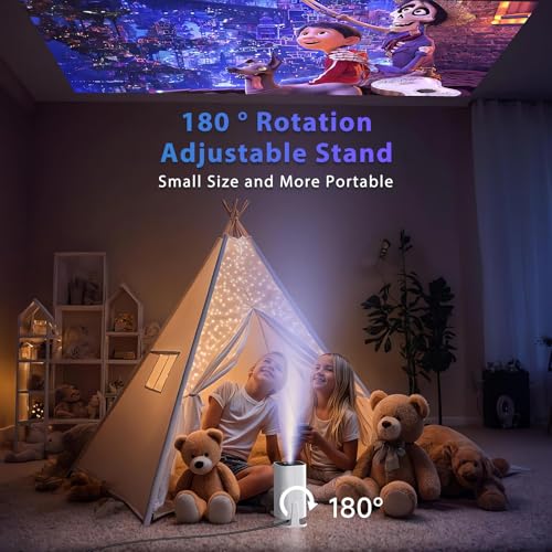 【Proyección Giratoria de 180°】 Convierte cualquier superficie en un lienzo cinematográfico! Nuestro proyector gira sin problemas para proyectar en paredes, techos o incluso el suelo. Disfrute de una experiencia visual inmersiva desde cualquier ángulo dentro de su hogar. Puede ver en cualquier ángulo de 40 a 130 pies con una imagen clara en la pantalla.