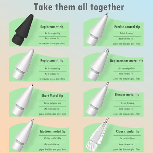 Juego de puntas de múltiples experiencias: 1 punta de metal resistente más larga con detalles visibles para Apple Pen, 1 punta de metal transparente más larga para Apple Pen, 1 bolígrafo extendido ultrafino como punta. 1 punta de lápiz de longitud media. 1 punta original de Apple modelo de punta de metal duradera es más suave. 1 punta de metal que te hace lápiz como un bolígrafo. La punta de metal es suave sin rayar el protector de pantalla. 2 puntas de repuesto resistentes blancas y negras, mantén múltiples accesorios de punta clásica para tu Apple Pencil.