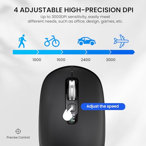 Especificaciones: Ratón silencioso inalámbrico Bluetooth para portátil Mac, interruptor de un clic multidispositivo, rodillos de metal de alta velocidad de 4 vías, DPI ajustable, ergonómico de tamaño completo
