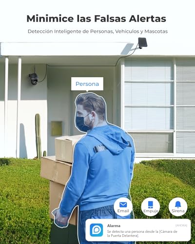 DETECCIÓN INTELIGENTE & ALERTAS INSTANTÁNEAS: La detección avanzada de personas y vehículos ayuda mucho en la reducción de alarmas inútiles. Una vez que se detecte algún posible peligro, la cámara le enviará alertas instantáneas como correos electrónicos o notificaciones push. En cuanto a la reproducción, esta cámara admite el filtro de eventos de personas o vehículos para localizar lo más rápido posible los momentos cruciales.