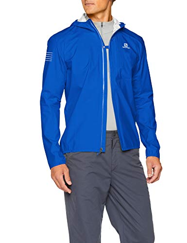 Chaqueta deportiva de hombre con capucha y capa impermeable para día y noche, running, trail running y otros deportes al aire libre (todo el año) – Chaqueta deportiva ligera de tejido rip-stop impermeable, capa interior transpirable, tecnología MotionFit para ajustarse a la cintura, la cadera y la capucha y conseguir mayor libertad de movimiento – Chaqueta para todo el año: cremallera impermeable, cuello alto y capucha y puños ajustables, aberturas de ventilación traseras en los hombros – Práctico bolsillo delantero con doble cremallera para guardar la chaqueta, Mejor visibilidad y mayor seguridad de día y de noche gracias a los detalles reflectantes 360° – Contenido: 1 x Salomon Hombre Chaqueta deportiva, Bonatti WP, tejido: mezcla de sintéticos, color: Azul (Surf The Web), talla: M, L40379900