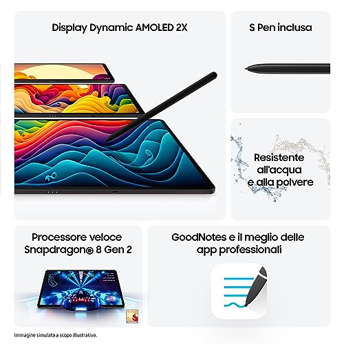 Especificaciones: SAMSUNG Galaxy Tab S9, Tablet AI, Pantalla 11″ Dynamic AMOLED 2X, Wi-Fi, RAM 12GB, 256GB, 8400mAh, Snapdragon 8 Gen 2, Android 13, IP68, Graphite, [Versión Italiana] 2023, Cargador 45W Incluido