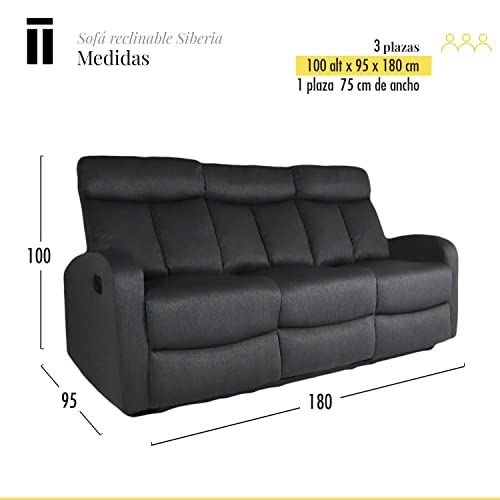 Especificaciones: SHIITO – Sofá de 3 Plazas y Función Relax – 180 x 100 x 95 cm – Modelo Siberia – 2 Asientos Respaldo y Reposapiés Reclinables – Apertura Manual – Gris