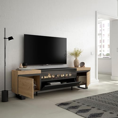 Skraut Home | Mueble TV | Televisión | Muebles de salón, almacenaje | 200x57x35cm | Para TV hasta 80″ | Chimenea eléctrica | Diseño industrial | Estilo Moderno | Roble y negro