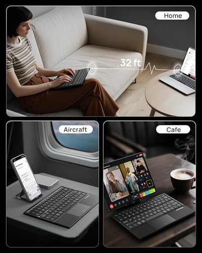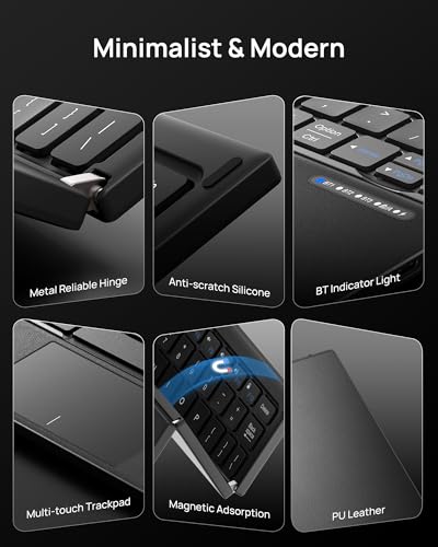 Teclado Bluetooth de tres pliegues: el teclado plegable mejorado 2025 cuenta con un diseño suave de estilo acordeón, lo que permite que se despliegue o pliegue en solo un segundo. El panel táctil incorporado sigue el mismo diseño que una computadora portátil estándar, haciendo juego con tu memoria muscular. Este teclado plegable con trackpad ofrece funcionalidad de tamaño completo en un diseño excepcionalmente delgado y ligero, sin volumen añadido.
