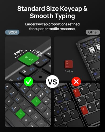 Diseño de tamaño completo: no te conformes con mini teclados estrechos. Este teclado plegable ofrece un diseño de 5 filas de tamaño completo con una fila numérica dedicada, ofreciendo una experiencia de escritura familiar y cómoda. Las teclas de 0.63 pulgadas combinan mejor con el tamaño de los dedos para una entrada precisa y eficiente, lo que te ayuda a mantenerte productivo en cualquier lugar.