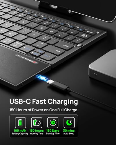 Recargable tipo C: proporciona hasta 150 horas de tiempo de trabajo y hasta 180 días de espera con una carga completa. Este teclado plegable con panel táctil entra automáticamente en modo de suspensión después de 30 minutos de inactividad para ahorrar energía, y se despierta instantáneamente con una sola pulsación de tecla. Mantente enfocado en tu trabajo sin preocuparte por recargar.