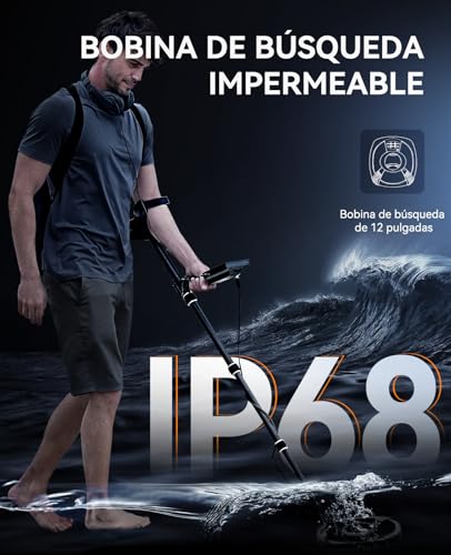[Bobina Impermeable de 12″ para Uso en Cualquier Clima] – La bobina de búsqueda de 12 pulgadas con una clasificación de impermeabilidad IP68 permite la detección de metales en diversas condiciones climáticas, incluyendo playas arenosas y bosques densos. Este detector de metales impermeable para adultos asegura que puedas buscar tesoros en casi cualquier entorno. (Nota: la caja de control no es impermeable).