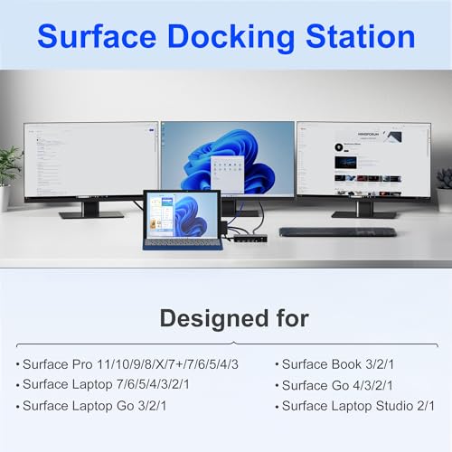 【Universal Compatibility with Plug & Play Ease】Designed for a seamless setup, our Surface docking station offers broad, plug-and-play compatibility with no drivers required. It works effortlessly with: Microsoft Surface Pro 11/10/9/8/7/6/5/4/3, Surface Laptop 7/6/5/4/3/2/1, Surface Go 4/3/2/1, Surface Laptop Go 3/2/1, Surface Laptop Studio 2/1, and Surface Book 3/2/1. This Surface laptop docking station is engineered to simplify your workspace and expand your device’s capabilities instantly.