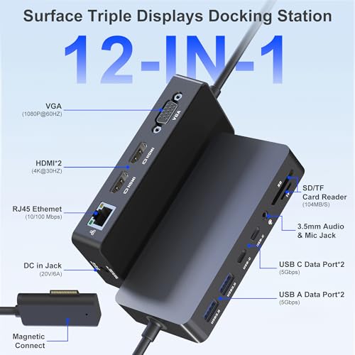 Surface Docking Station, Triple Display Dual 4K HDMI & VGA, 12-in-1 Surface Pro Dock for Microsoft Surface Pro 11/10/9/8/7/6/5/4/3, Surface Laptop 7/6/5/4, Surface Go/Book/Laptop Go