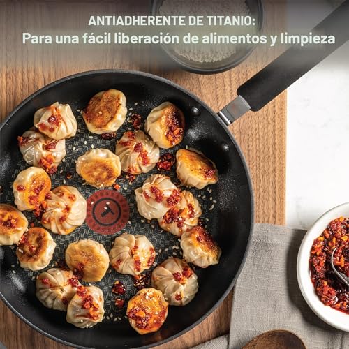 Construcción duradera: El exterior anodizado en duraluminio y el diseño forjado están construidos para soportar la prueba del tiempo. El revestimiento antiadherente de titanio mantiene los alimentos deslizados suavemente, lo que hace que cocinar sea más fácil y limpiar sea muy fácil.