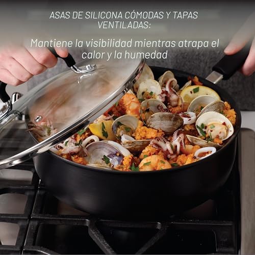 Diseño Top class: Los mangos de silicona remachados proporcionan un agarre cómodo, mientras que las tapas de vidrio templado con ventilación atrapan el calor y l. a. humedad mientras mantienen l. a. visibilidad. Ya sea que cocines una receta favorita o un nuevo plato experimental, esta colección es lo suficientemente resistente para satisfacer todas tus necesidades de cocina.