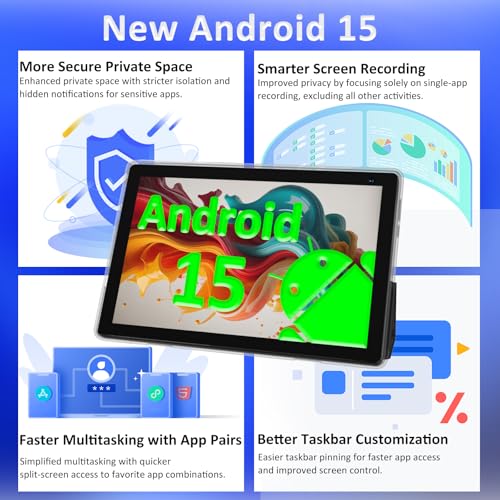 【Tableta Android 15】 La tableta CP10 Pad funciona con el último sistema operativo Android 15 con IA, lo que garantiza una compatibilidad más amplia de aplicaciones, tiempos de inicio más rápidos y una mejor capacidad de respuesta. El nuevo sistema proporciona una experiencia más personalizada y segura, protección de privacidad mejorada y seguridad.