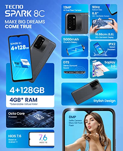 TECNO Mobile Spark 8C Smartphone Android, Dual SIM, 720 x 1612px HD + D, cámara frontal de 8 MP y cámara dual AI de 13 MP, memoria de hasta 4 + 128 GB, batería de 5000 mAh, NFC, optimizado para redes