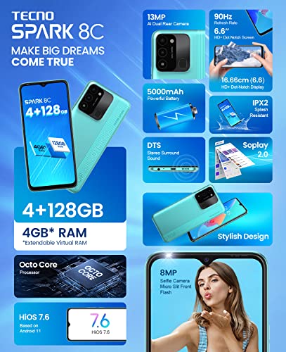 Especificaciones: TECNO Smartphone Mobile Spark 8C Android, Dual SIM, pantalla HD + D de 720 x 1612 px, cámara frontal de 8 MP y cámara dual AI de 13 MP, memoria de hasta 4 + 128 GB, batería de 5000 mAh, NFC,