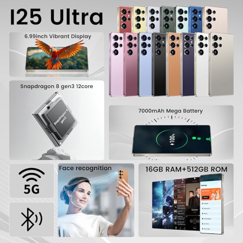 Especificaciones: Teléfono inteligente I25 Ultra Desbloqueado: Pantalla FHD+ de 6.99″, 16GB RAM 512GB, batería 7000mAh, cámara de 108MP+68MP, lápiz óptico incorporado | Teléfono Android más rápido para