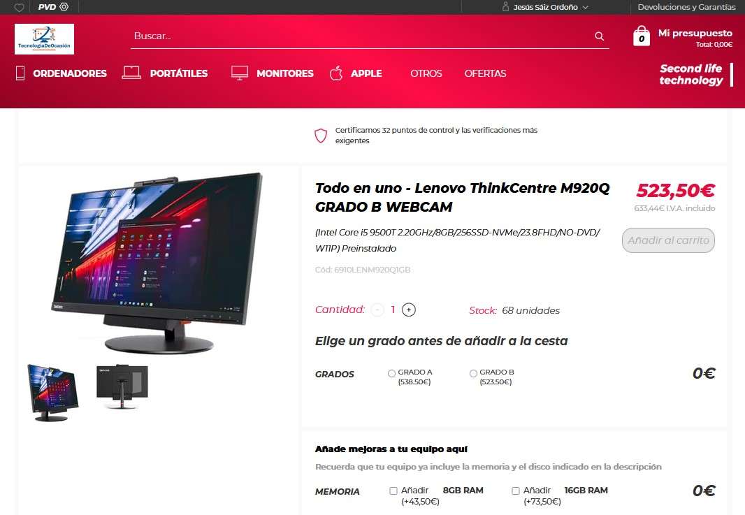 Características Equipos comprobados y testeados completamente. Pueden tener signos de desgaste o arañazos en su carcasa, o pantalla, pero son completamente funcionales.Estos equipos incluyen licencia de Windows 11 PROGRADO BOrdenador Sobremesa Todo en UnoEspecificaciones:· Marca Lenovo · Procesador Intel Core i5 9500T 2.20 GHz 6 núcleos, turbo 3.70 GHz · Gráfica Intel UHD 630 · Disco Duro 256GB SSD-NVMe (Varias marcas, según disponibilidad) · Memorias 8GB DDR4 (2 zócalos) · Panel Pantalla de 23.8″ 1920 x 1080 FHD · Modelo monitor TIO24 Gen 3 · Lector/Grabador NO · Wifi NO · Bluetooth NO · Webcam SI · VESA 100X100mm SI · Conexiones x5 USB 3.1, x1 USB C, x1 displayport, x1 HDMI, x1 RJ45 – Testeados y 100% verificados |