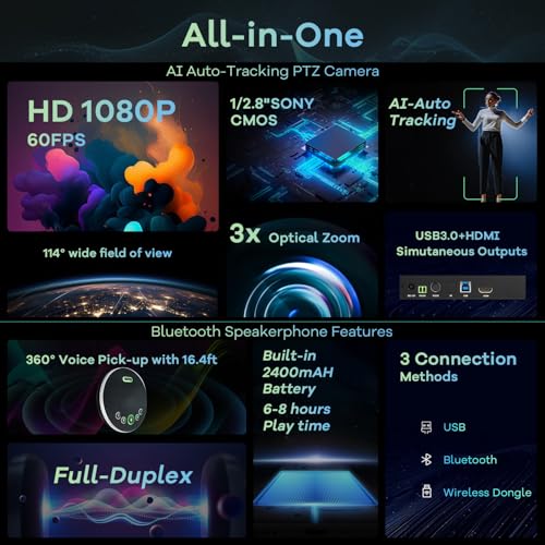Especificaciones: TONGVEO Sistema de cámara de video todo en uno para sala de conferencias HD 1080P 60fps zoom óptico 3X USB3.0 HDMI PTZ cámara y altavoz de conferencia Bluetooth con micrófonos