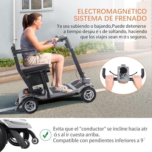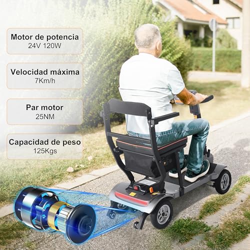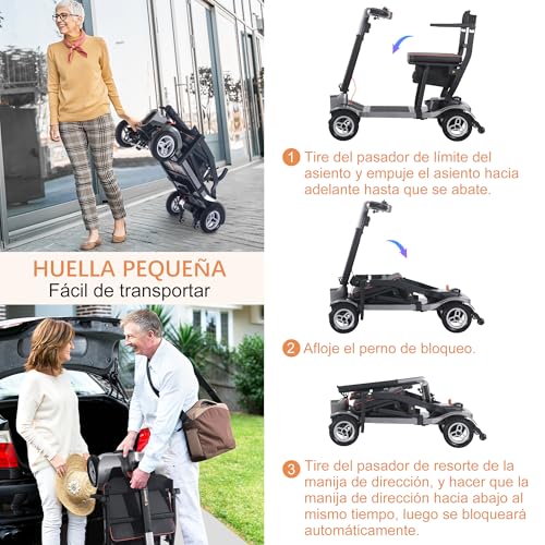 【Diseño Plegable y Ligero】El patinete de movilidad de 4 ruedas se pliega fácilmente en dos pasos, ahorrando espacio y haciéndolo conveniente para llevar mientras viajas. El patinete de movilidad ligero para adultos pesa solo 17,4 kg, pero puede soportar hasta 125 kg, lo que lo convierte en una opción ideal para usuarios con problemas de movilidad.