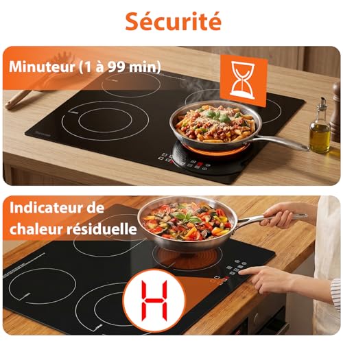 【Protección de seguridad】La placa vitrocerámica de 60 cm se apaga automáticamente si se sobrecalienta, y el bloqueo infantil evita que los niños la toquen accidentalmente, lo que la hace más segura. Control preciso del tiempo: Tiempo libre de 1 a 99 minutos, apagado automático en el momento oportuno, sin necesidad de espera. Recordatorio de calor residual: Tras detener el calentamiento, el panel de avisos mostrará la temperatura alta «H» para evitar quemaduras.