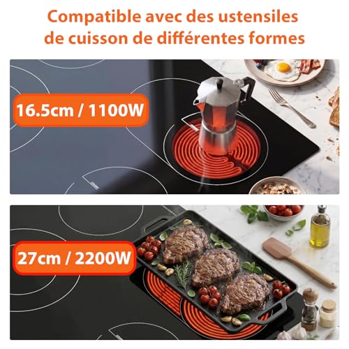【Cocción eficiente】Esta placa vitrocerámica de 4 fuegos cuenta con 4 quemadores con potencias de 1200W (165 mm)*2, 1100/2200W (230mm)*1 y 1100/2000W (165*270 mm)*1. El diseño de doble anillo permite un control preciso de la temperatura, con calentamiento centralizado de un solo anillo y calentamiento uniforme de doble anillo, y se adapta a ollas de diferentes tamaños.