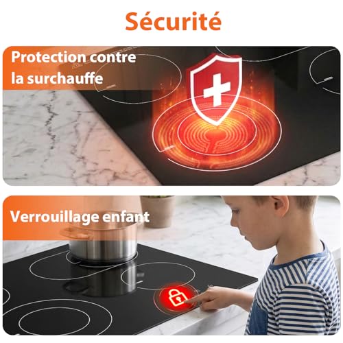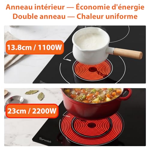 Especificaciones: Topwish placa de vitrocerámica, placa vitroceramica 4 fuegos, con zonas dobles y ovaladas, vitrocerámica encastrable 60cm, con cierre de seguridad, Indicador de superficie caliente, 6600W