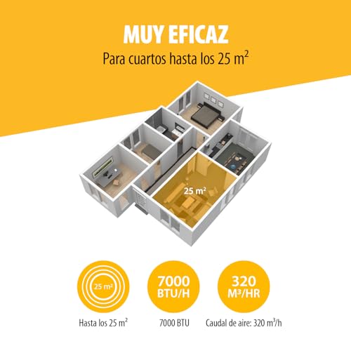 POTENTE: con una capacidad de refrigeración de 7.000 BTU y un caudal de aire de 320 m³/h, es ideal para estancias de hasta 25 m². Gracias a su etiqueta energética A, sabes que consume poca energía.