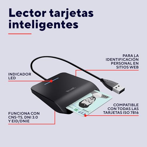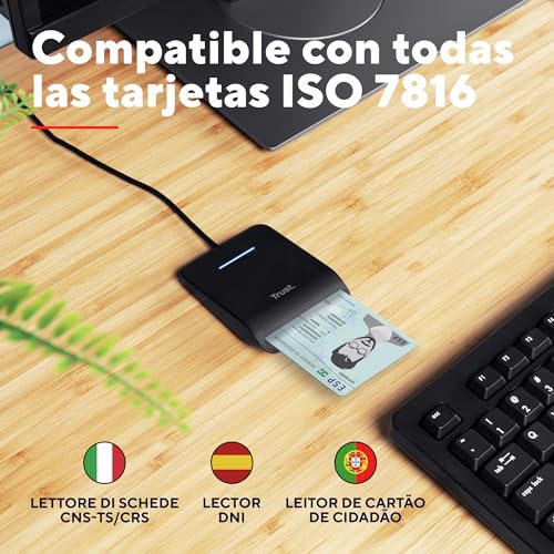 Especificaciones: Trust Primo Lector DNI Electrónico USB, Lector de Tarjetas DNI para la Identificación Personal, Cumple con FIPS 201, FIPS TAA e ISO 7816 Clase A, B, C, Cable de 100 cm, Mac y Windows – Negro